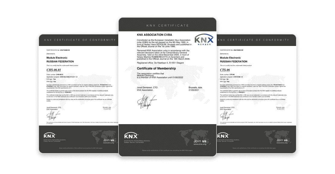 Наше KNX оборудование соответствует европейским и международным стандартам. Все устройства прошли тестирование и сертификацию в ассоциации KNX и имеют сертификат CE, что гарантирует полную рабочую и функциональную совместимость.